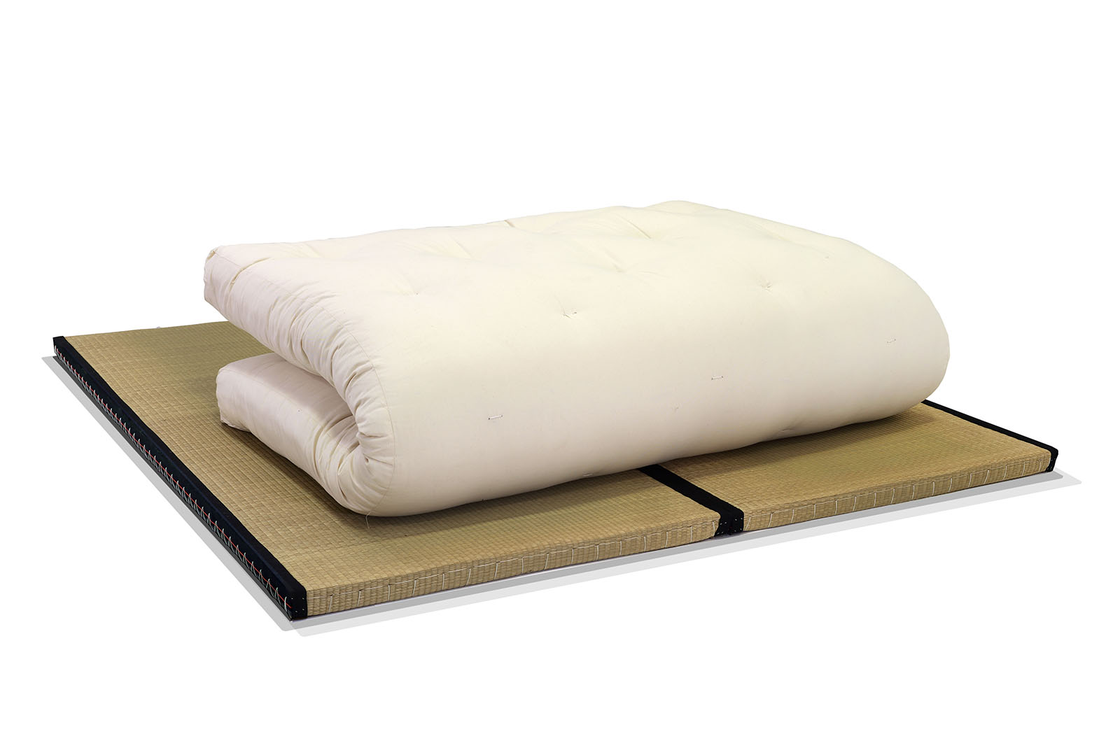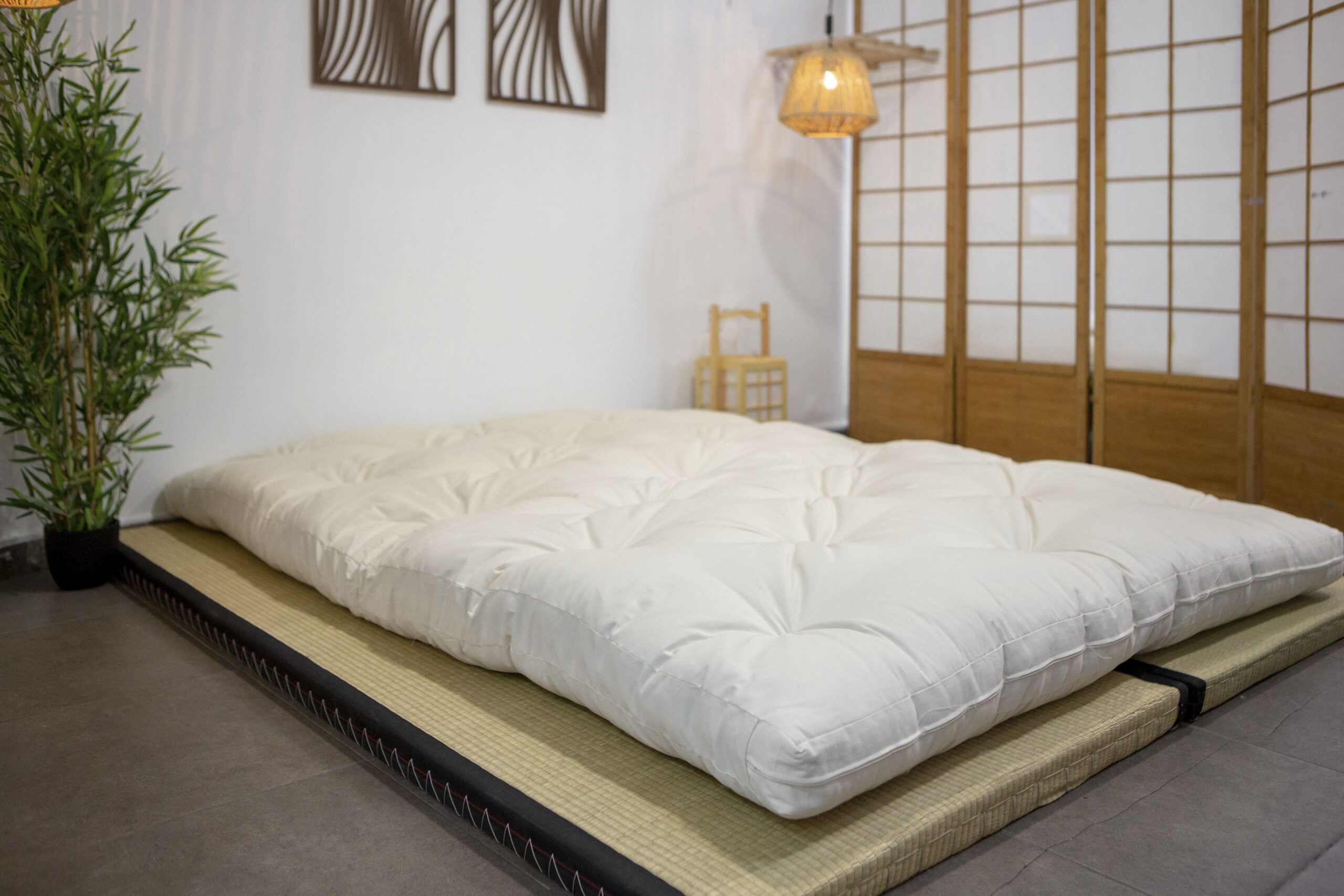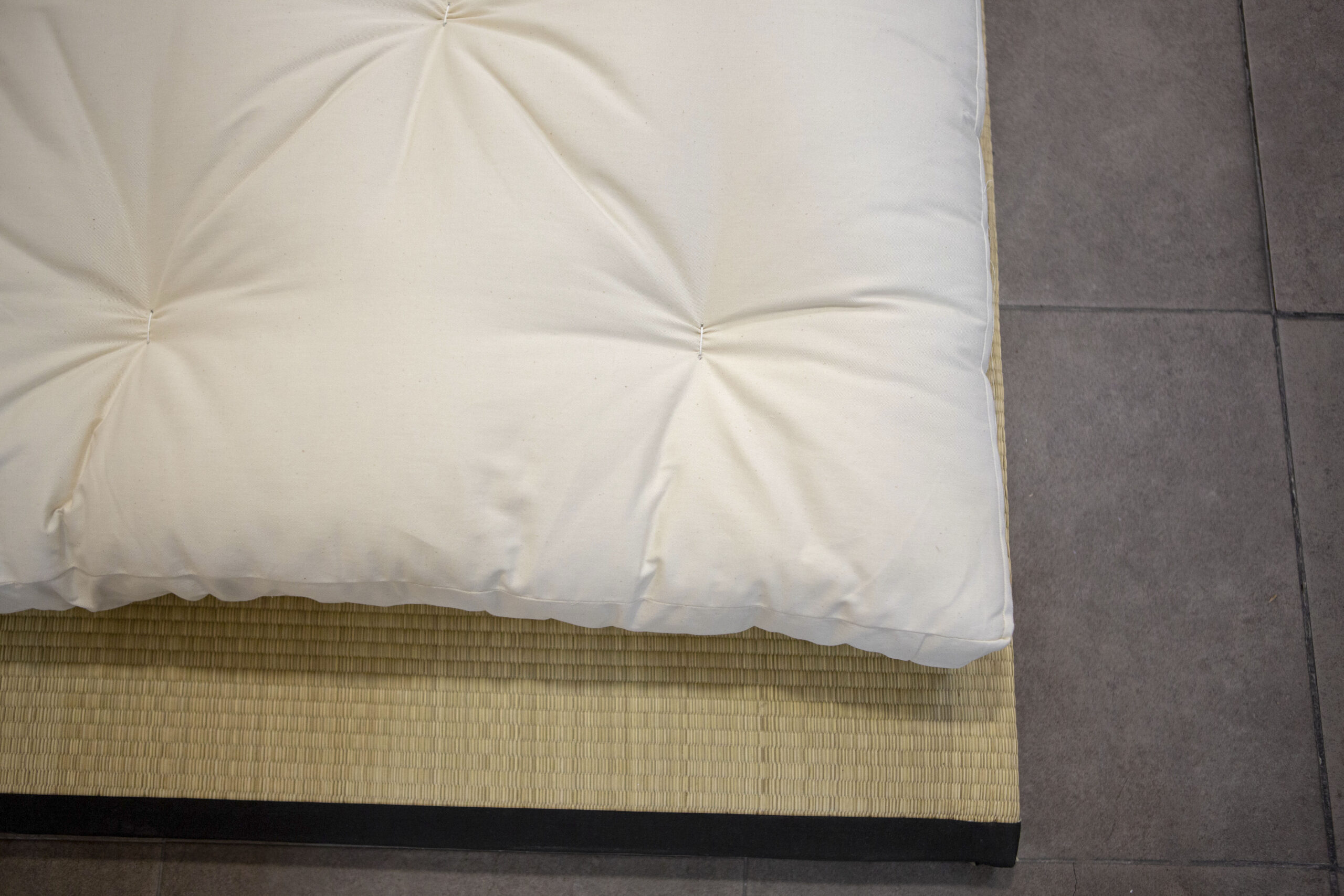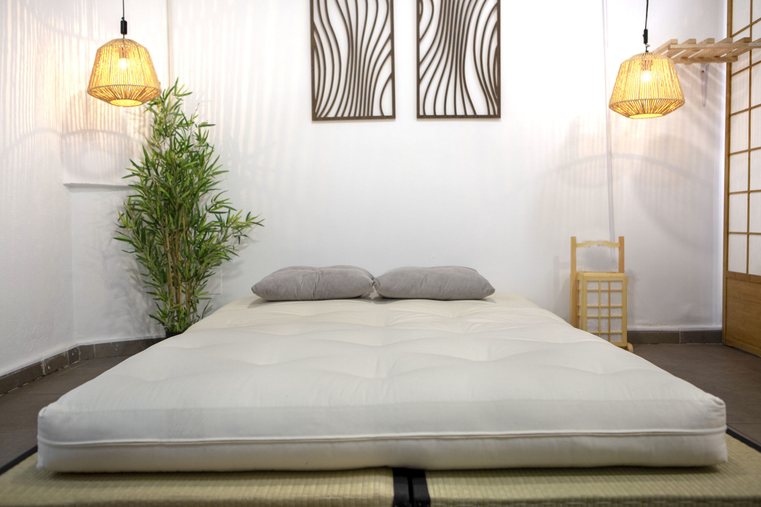 Los tatamis artesanales, fabricados con paja de arroz prensada y recubiertos de junquillo, aportan estabilidad y aislamiento térmico. Sobre ellos, el futón japonés de algodón y una capa de látex garantiza un descanso ergonómico y saludable, sin materiales sintéticos. Este modelo de futón incluye una capa de látex de alta densidad de 4 cm en su interior, convirtiéndolo en una opción más esponjosa que el futón de algodón.