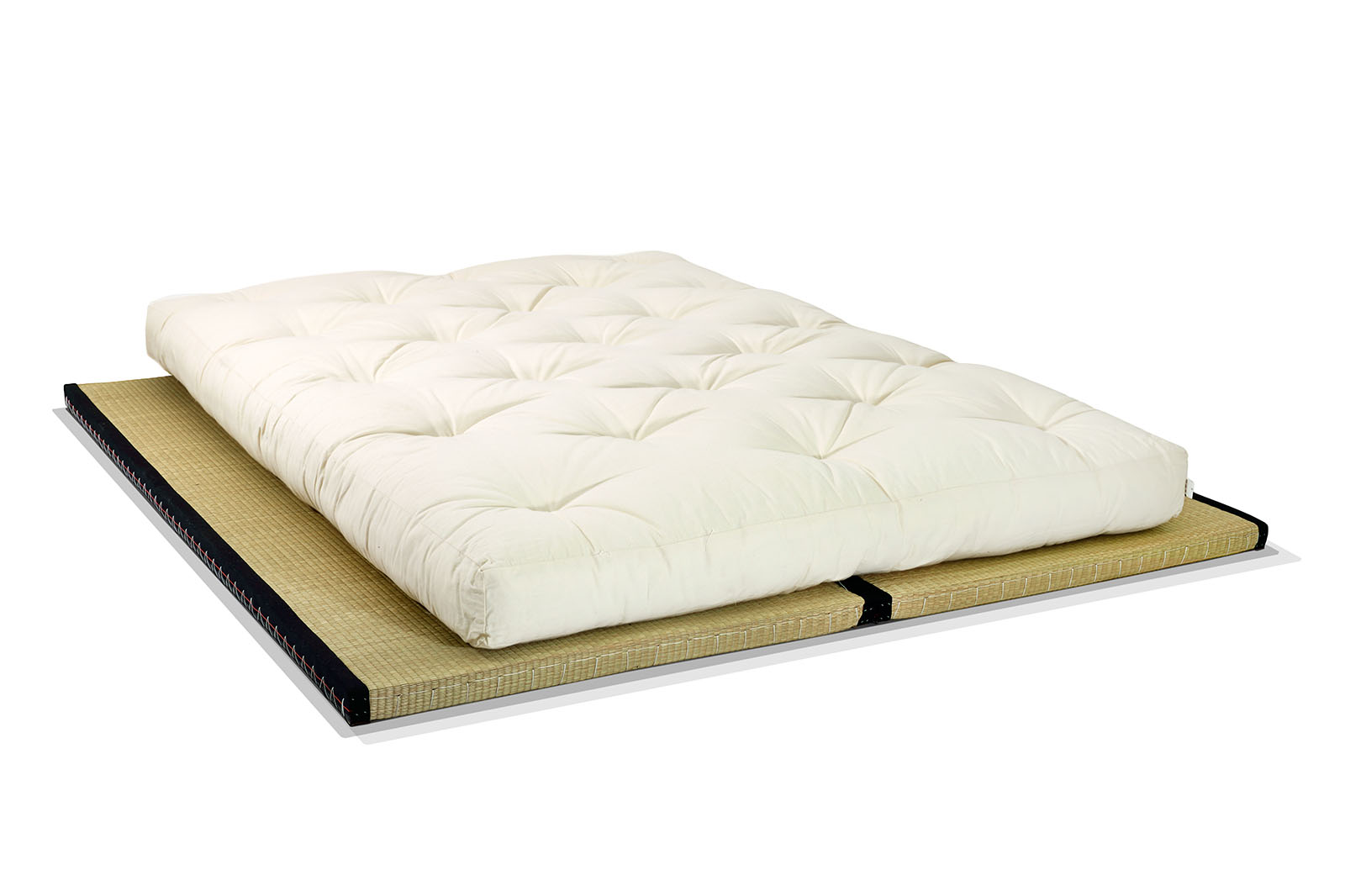 Crea tu propio espacio de descanso de estilo japonés con esta combinación de dos tatamis japoneses y un futón de algodón 100% natural y una capa de látex orgánico. Esta solución minimalista y ecológica proporciona un soporte firme y transpirable, ideal para quienes buscan una cama japonesa auténtica y funcional.