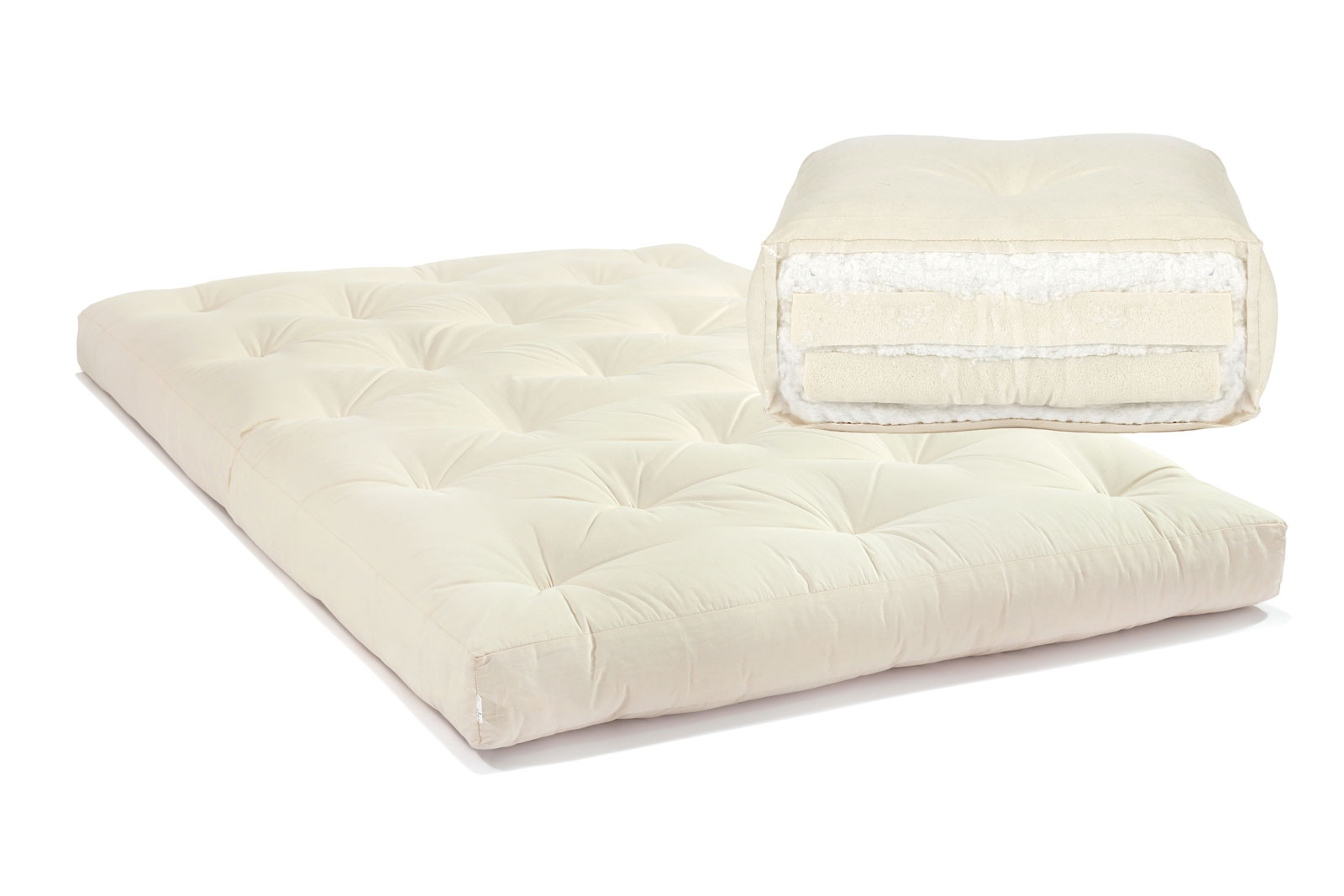 Futón japonés de algodón y dos capas de látex. El futón perfecto para dormir, para sofás cama y más. Consigue tu futón artesanal compuesto de algodón 100% y látex natural. Disponible en varias medidas y grosores. Contáctanos para crear tu futón a medida.