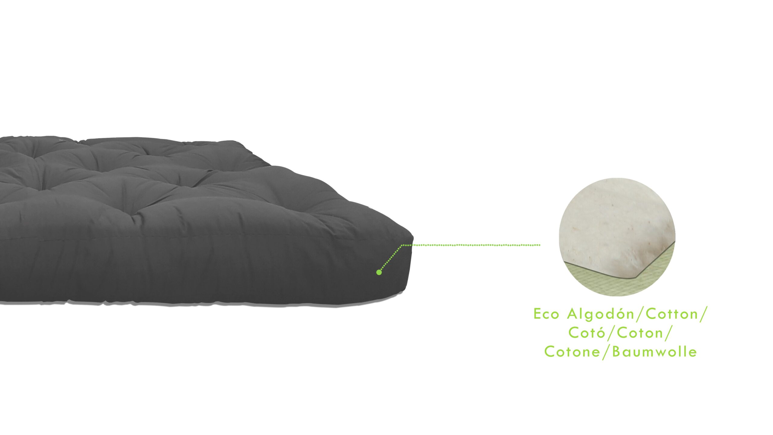 Elaborado con algodón ecológico y confeccionado con un sistema de sujeción por puntos, este futón asegura que el relleno se mantenga en su sitio, ofreciendo comodidad, transpirabilidad y durabilidad en el uso diario.