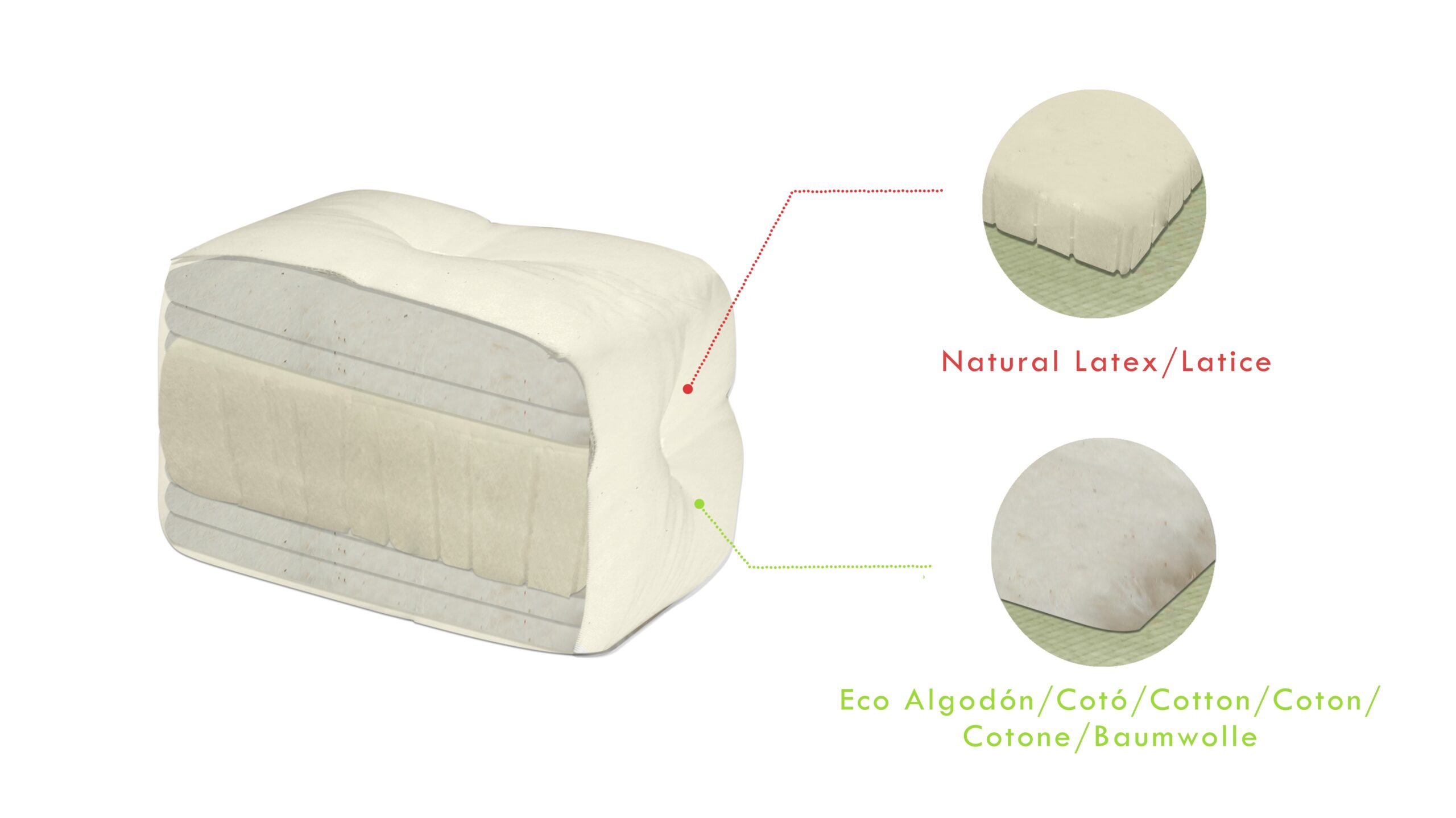 Este modelo está formado por una capa de látex recubierta de algodón natural, lo que asegura una elasticidad duradera y evita que el colchón pierda su forma con el tiempo. Su sistema de sujeción por puntos mantiene el relleno en su sitio, aportando estabilidad y resistencia.