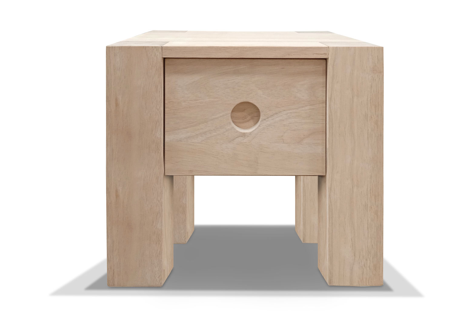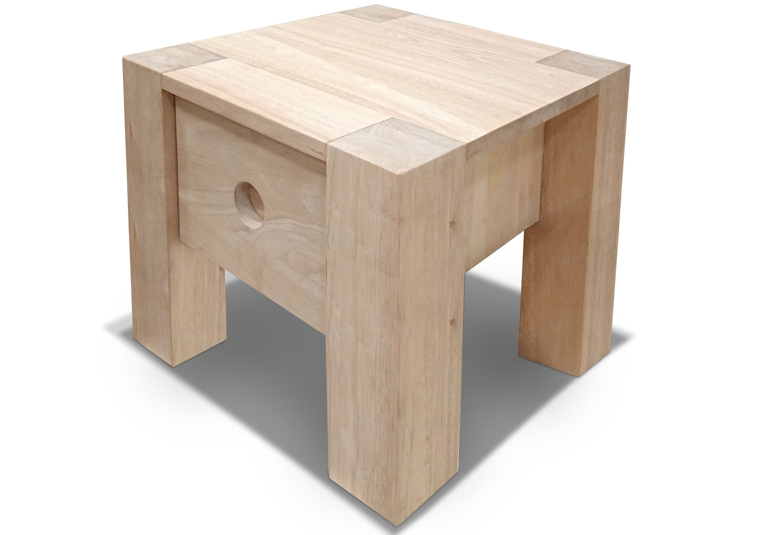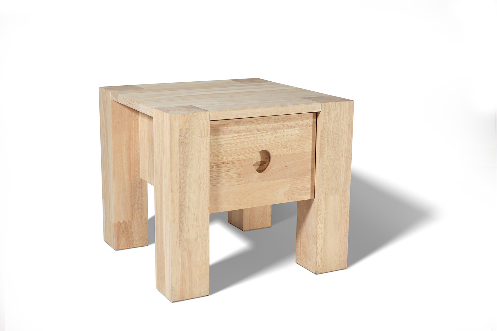 Fabricada con madera maciza de hevea, esta mesita es resistente, duradera y está disponible en acabado natural sin barnizar para mantener su esencia orgánica. Su práctico cajón espacioso permite almacenar objetos esenciales, asegurando orden y comodidad en tu espacio de descanso.